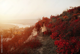 Back of couple holding hands and walking in a park at colourful sunset light during autumn season with red leaves.
