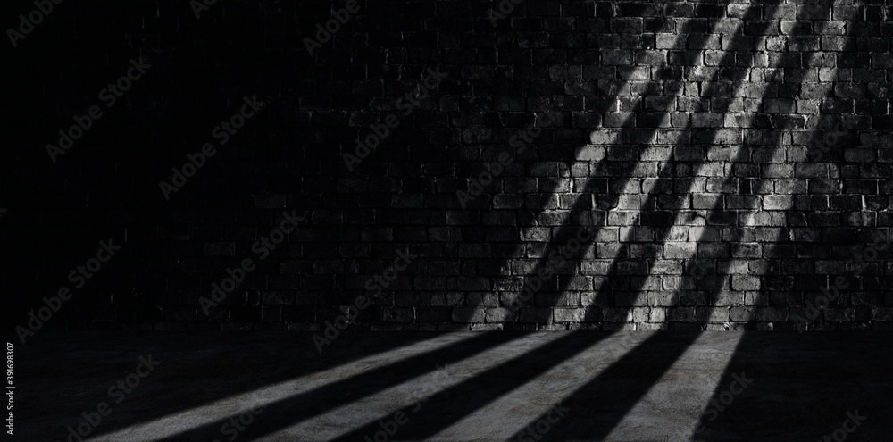 Empty space of Studio dark room black brick wall grunge texture background with light shading.