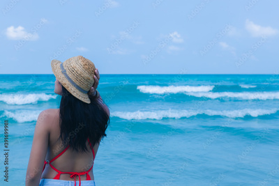 Beautiful woman in bikini and shorts on tropical beach. Portrait happy young asian woman enjoying at beach. Traveler female wear straw hat, stand on beach and get relaxing in summer vacation time