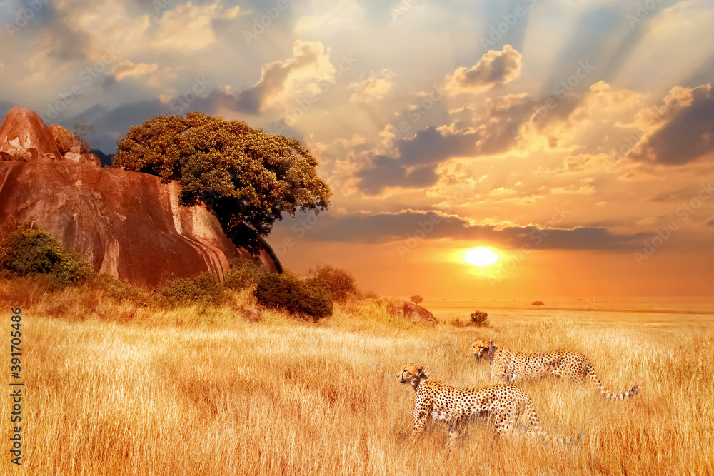 Cheetahs in the African savanna against the backdrop of beautiful sunset. Serengeti National Park. Tanzania. Africa.