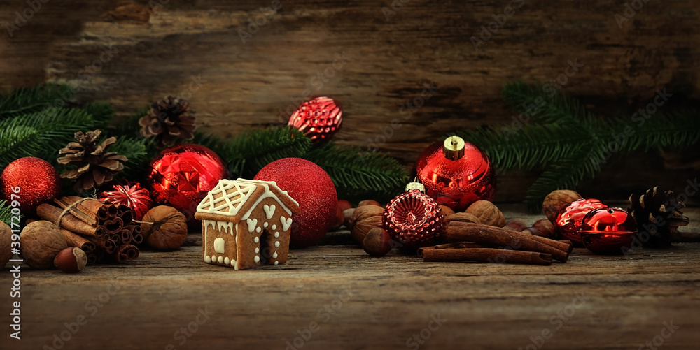 Gingerbread house, Christmas tree decor on dark wooden background. Christmas and New Year concept. winter holiday season