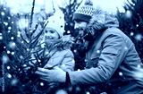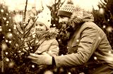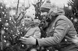 family, winter holidays and people concept - happy father and little daughter choosing christmas tree at street market over snow