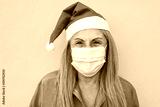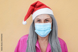 Happy senior woman wearing christmas hat with protective face mask - Focus on face