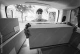 Delivery man picking up box from van while wearing face mask - Shipment service during coronavirus outbreak - Focus on face