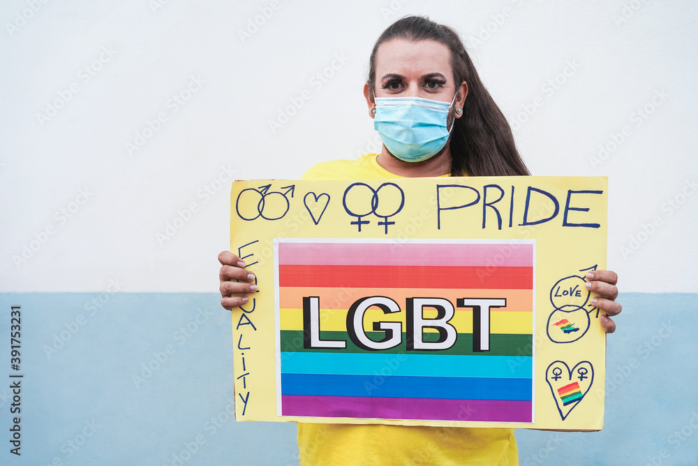 Happy transgender with mask holding lgbt banner at gay pride - Protest for equality rights concept - Focus on face