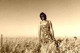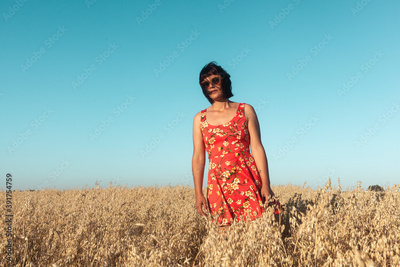 Girl in a wheat field with blue sky and a red dress in a state of happiness and freedom