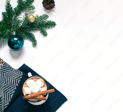 Christmas, New Year white frame with a cup of cacao with marshmallow. Winter holiday flat lay. Top view. Copy space