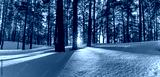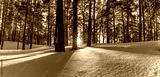 Beautiful snowy winter landscape panorama with forest and sun during golden hour. Winter sunset in forest panoramic view. Sun shines through trees and casts golden light on snow. Russia, Siberia