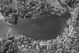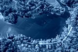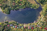 Drone view of summer cottages over Narie lake of Ilawa Lake District in Kretowiny, small village in Warmia Mazury region of Poland