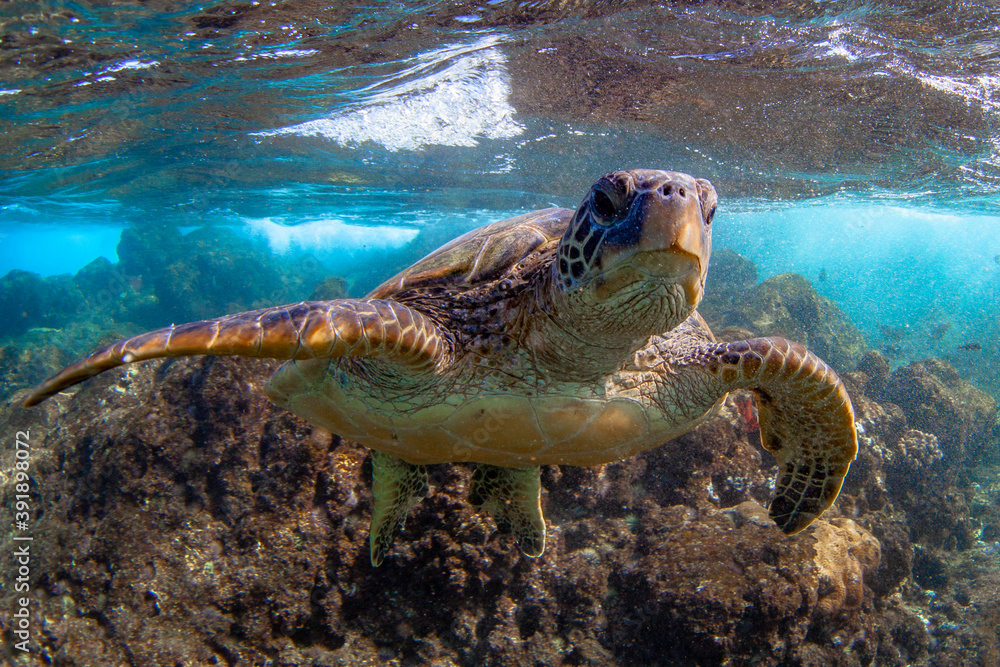 Hawaiian Green sea Turtle cruising in the warm waters of Maui