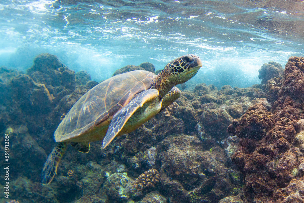 Hawaiian Green sea Turtle cruising in the warm waters of Maui