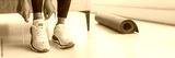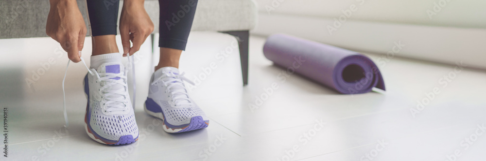 Home workout woman getting ready for training tying her purple running shoes and yoga mat banner panoramic. Fitness during coronavirus, active sport.