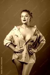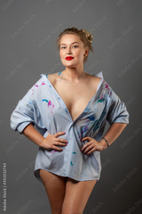 sexy girl in a shirt stained with paint with a bare shoulder.
