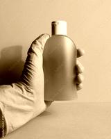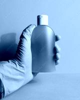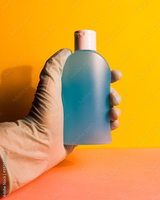female hand with protective glove holds unlabelled plastic bottle with antiseptic shampoo shower gel lotion cleanser. yellow and pink background