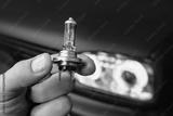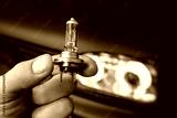 Car repair and service. The man holds in his hand a halogen light bulb against the background of the headlights on.