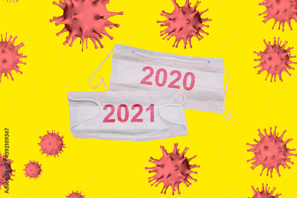 New Year 2021. The concept of changing the year from 2020 to 2021. Medical masks on a yellow background with coronavirus molecules. 3D-model.