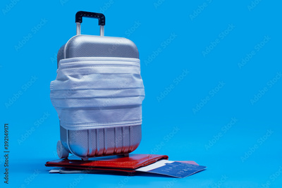 Time to travel. Flight cancellation and safe rest concept during a pandemic Covid-19 Coronavirus. Suitcase for travel with a medical mask and plane tickets with a passport.