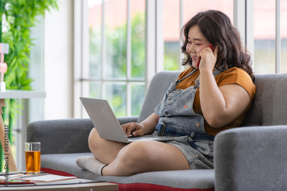 smiling fat woman sitting on a couch talking on a smartphone and looking at a laptop computer to communicate with people in a house. Work from home concept