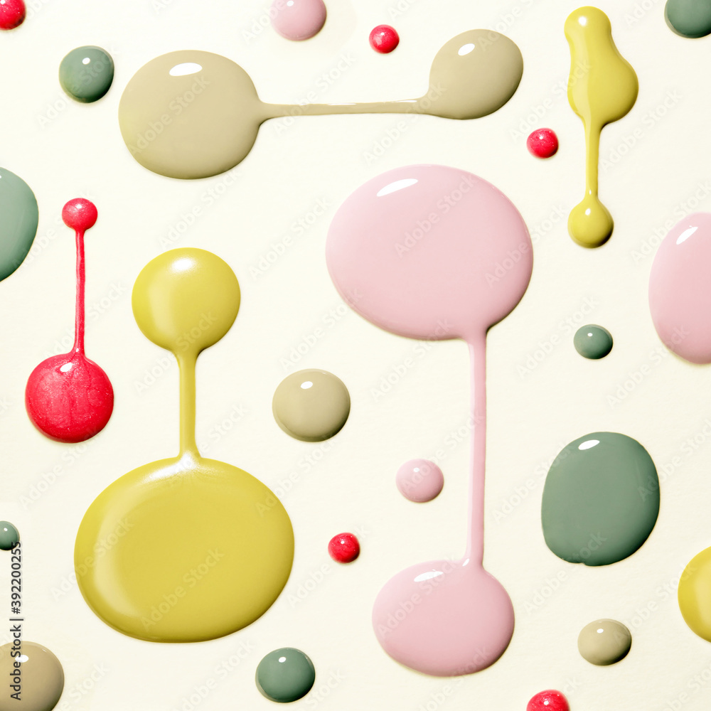 Nail polish rounded swatches on neutral light green background. Closeup of paint spills. Creative composition of various nail polish drops for manicure artist.