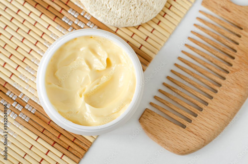 Yellow facial mask (banana face cream, shea butter hair mask, body butter) in the small white container. Natural skin and hair concept. Top view, copy space.