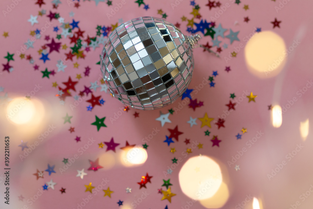 silver disco ball reflecting lights on pink background, greeting card with sparkles template, empty space for text