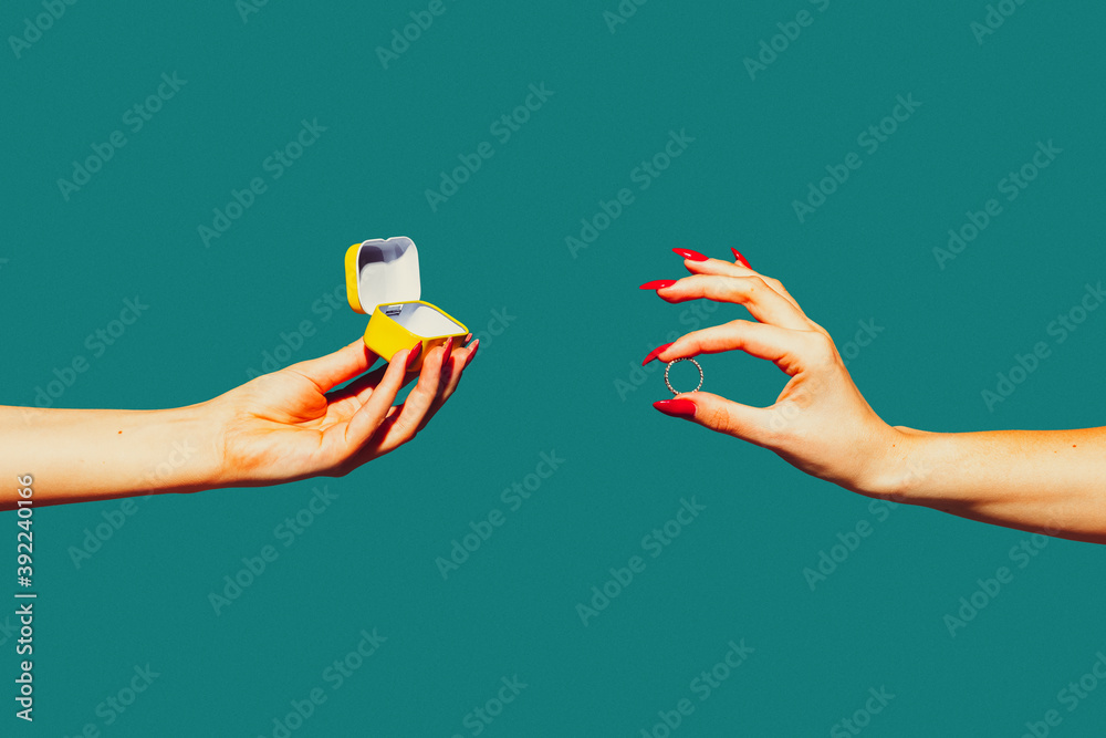 Marriage ring. Modern art collage in pop-art style. Hands isolated on trendy colored background with copyspace, contrast. Modern design with copyspace for advertising. Trendy colors.