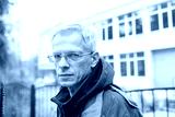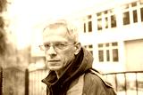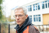 Mature handsome gray-haired man with glasses wary looks at the camera in autumn outdoors