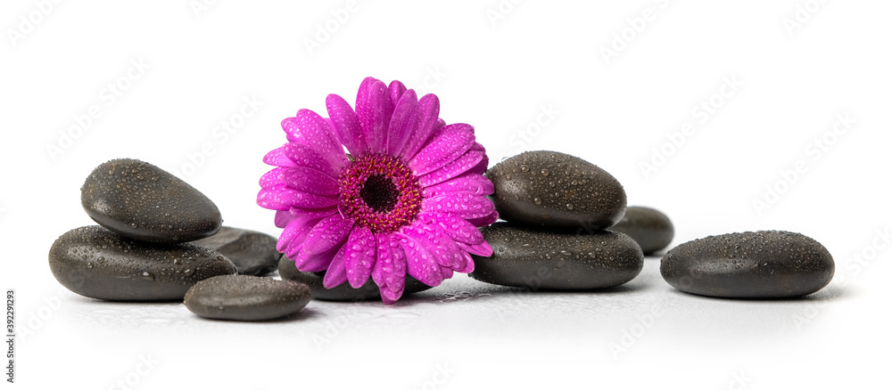spa and wellness - black wet massage stones with purple flower isolated on white background