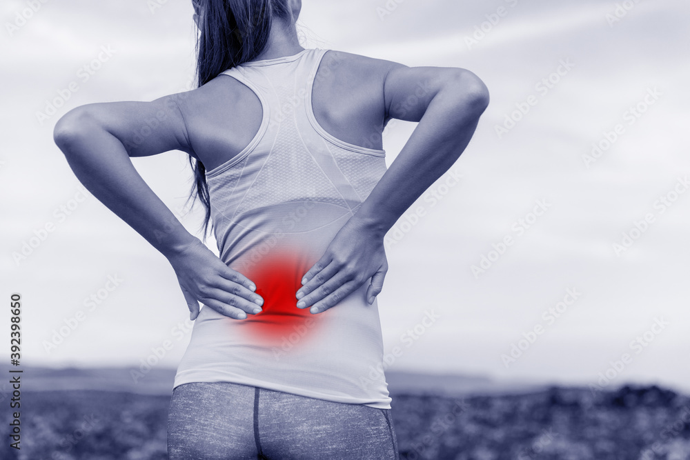 Back injury in sports. Athlete girl holding her lower back in pain rubbing the muscles touching red zone circle to show affected area with blue medical color filter.