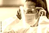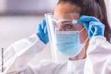 Protective shield adjustment by medical staff worker wearing white overall, blue gloves and disposable facemask