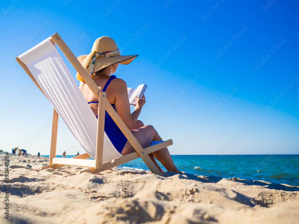 Woman relaxing on beach reading book sitting on sunbed