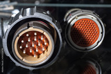 Round electrical connectors in dark. Two electrical connectors. Connectors for connecting to electric equipment. Concept - adjustment of electrical equipment. Connectors for high-voltage connection.
