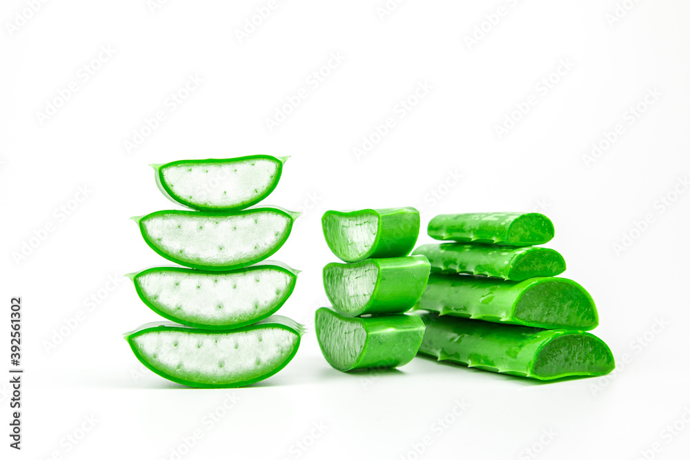 Slices of fresh aloe vera plant stacked and aloe vera stalk or leaves with water dropping isolate on white background.