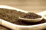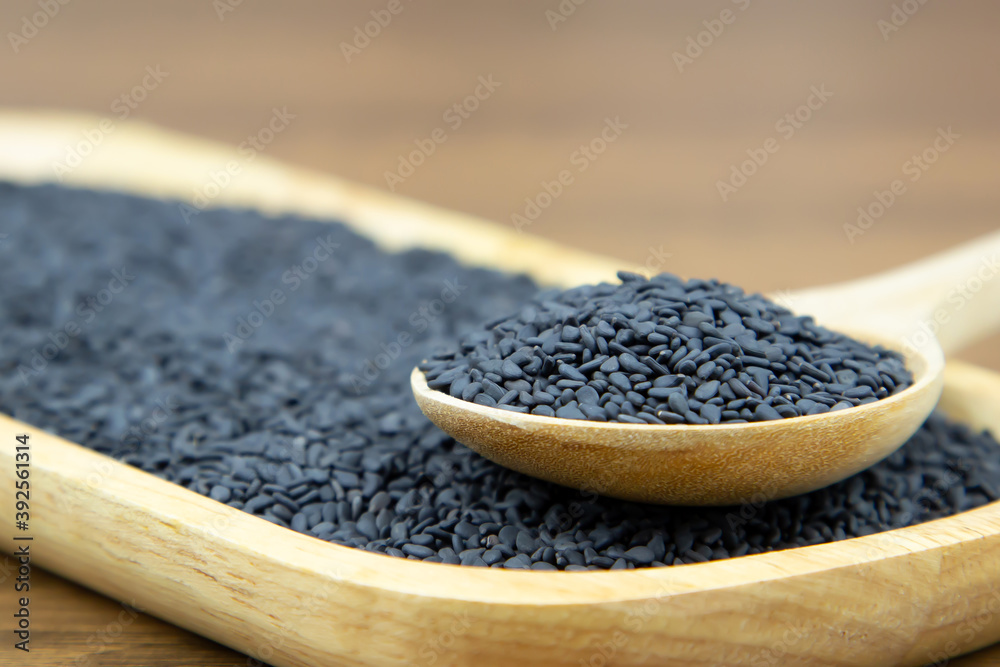 Black sesame seeds in a wooden spoon for healthy food and diet concepts.