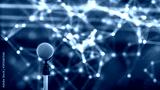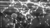 Public speaking backgrounds, Close-up the microphone on stand for speaker speech at seminar room with technology light background and blur bokeh.
