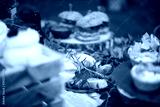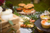 Relaxed outdoor garden party. Buffet table with organic tapas. Fresh baguette bread and tomato.