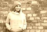 Happy girl looks to side. Young smiling woman model posing against bricks wall