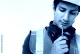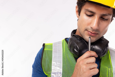Engineer man in hardhat thinking and planning his work in factory or site. Engineer or professional contractor hold pen. Business engineer guy get successful of his business. Architect has big project