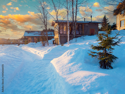 Paths in the snow lead through the cottage village. Private homes against a beautiful sky. Country houses in snowdrifts. View of cottages in winter.
