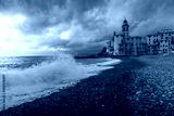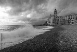 Scenic view of Camogli seaside with cloudy dramatic sky sea waves and buildings