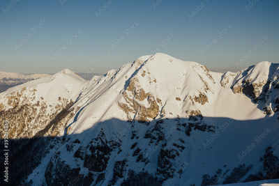 Scenic winter views of the rocky Mountains covered with snow in the sunny day. Beautiful nature.