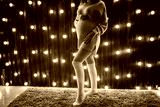 Cropped image of pregnant woman is standing near black wall with lights. Last months of pregnancy.