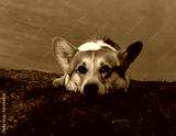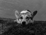 One Pembroke Welsh Corgi in the setting sun on a hilltop looks at the city