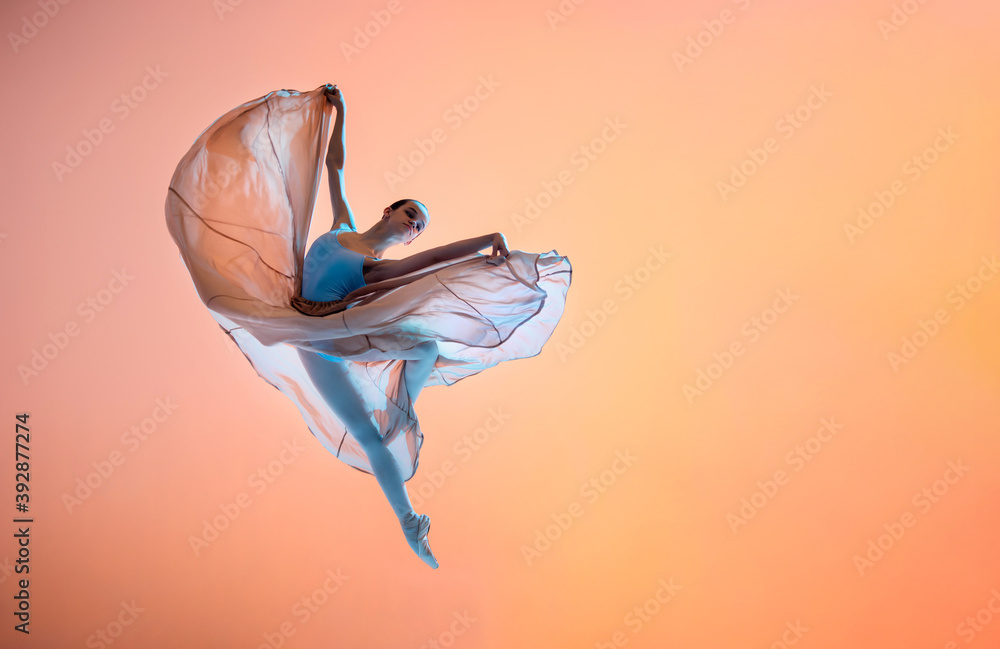 Ballerina in a light light dress flying in jump on an illuminated colored background