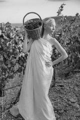 Girl picks grapes in the vineyard