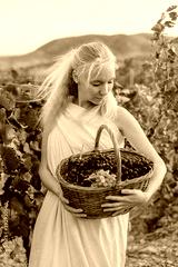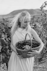 Girl picks grapes in the vineyard