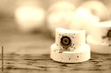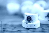 The soiled blue nozzles from the paint sprayer lies on a purple plank on a background of a many dirty spray cans