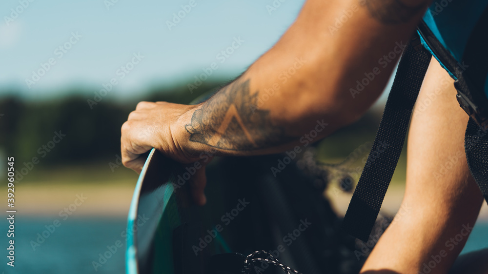 young man doing wakeboarding in a lake whit mountains also doing jumps