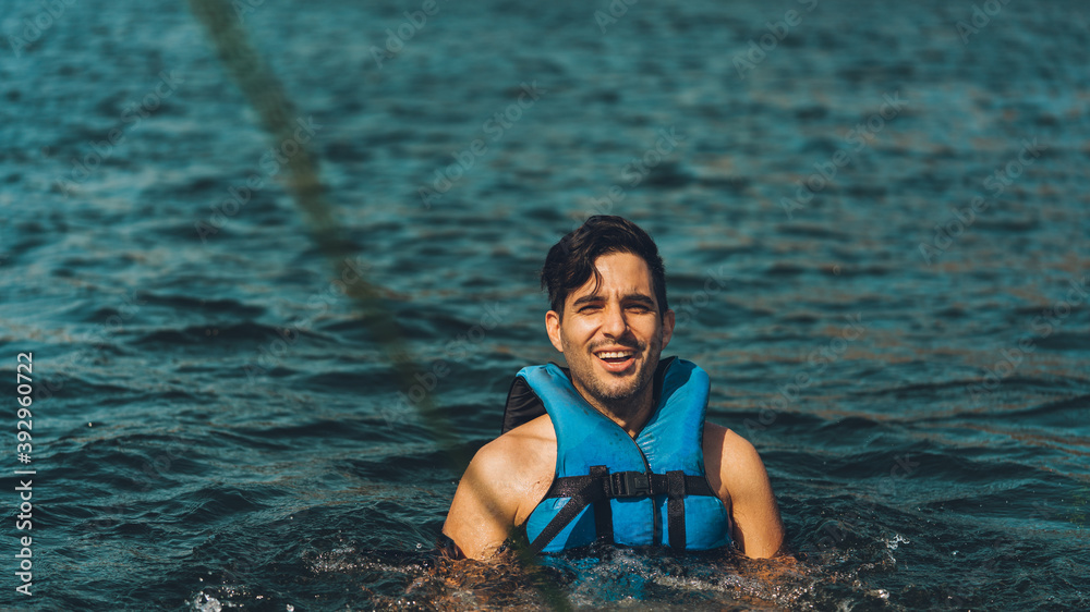 young man doing wakeboarding in a lake whit mountains also doing jumps