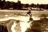 young man doing wakeboarding in a lake whit mountains also doing jumps